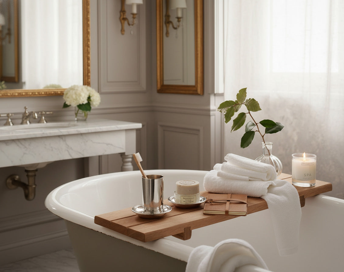 A crafted bath tray that transforms everyday moments into quiet luxury.